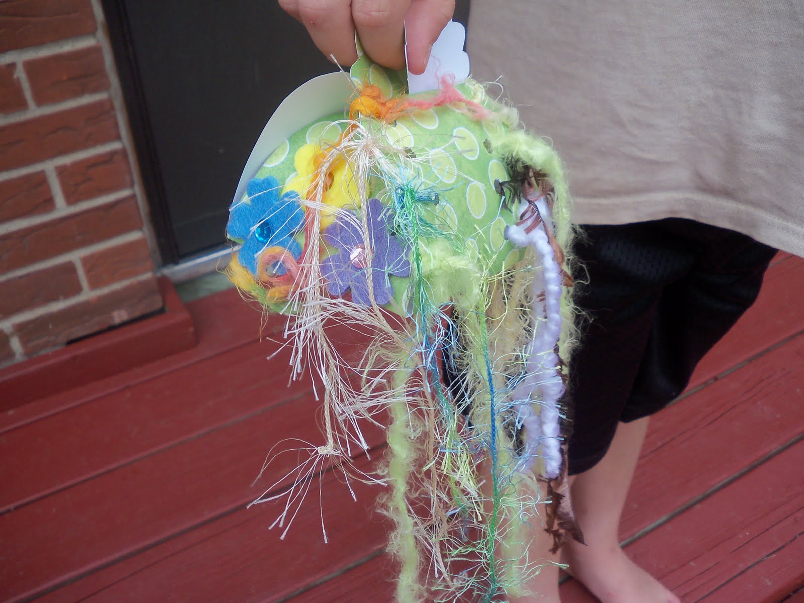 He added 3 felt flowers on the one side and punched some holes and added a variety of fibers for extra fun.